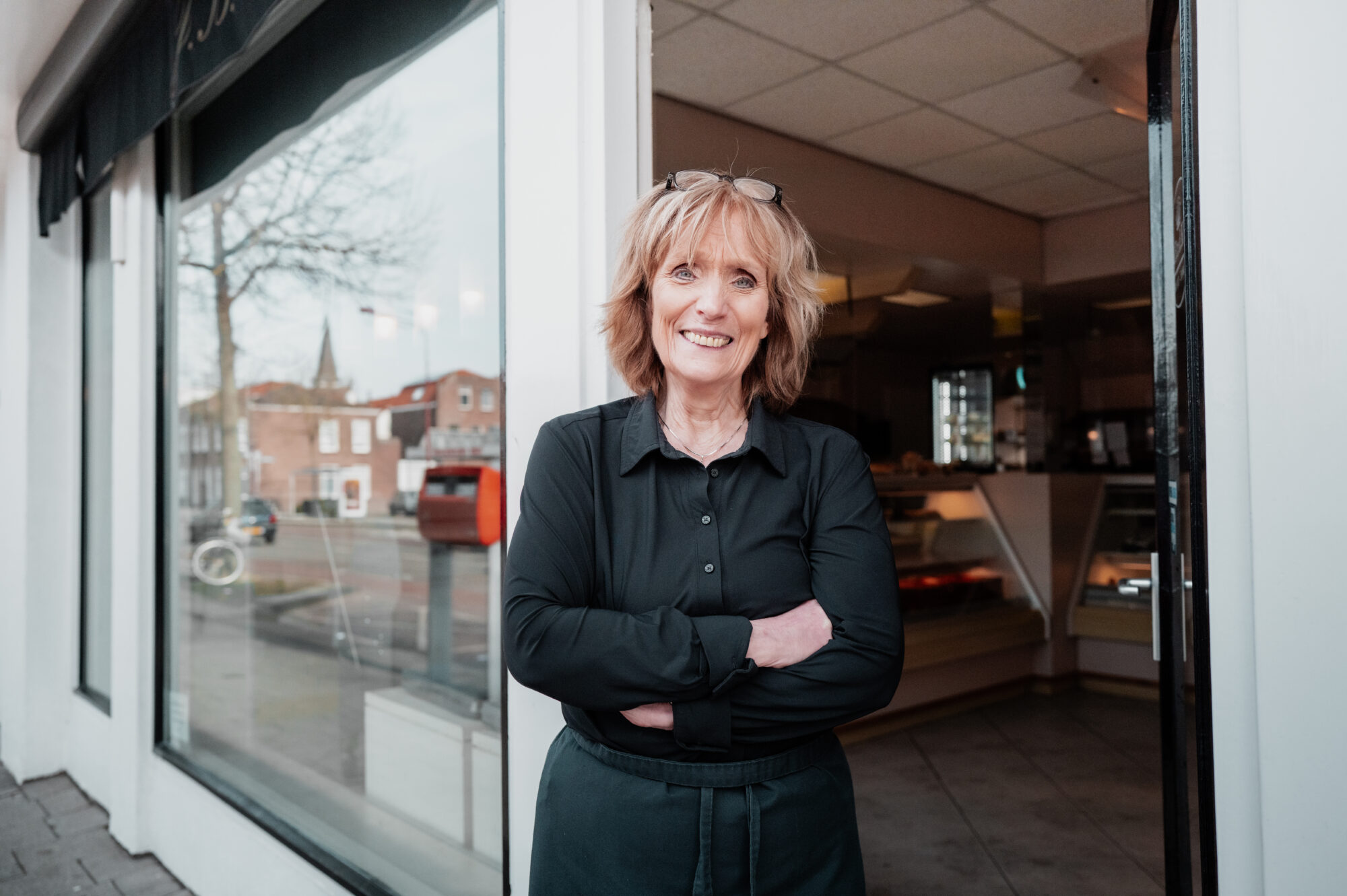 Ook andere familieleden springen bij waar nodig. Zo helpt Han’s zusje Ina trouw mee in de winkel. “Ina! Weet jij waar deze poort was?” roept Ria terwijl ze een oude zwart-witfoto omhooghoudt. “Die kreeg ik van Meijers frituren. Kijk nou – dit zijn opa en oma Van der Kop in de oude bakkerij. Geweldig toch?”