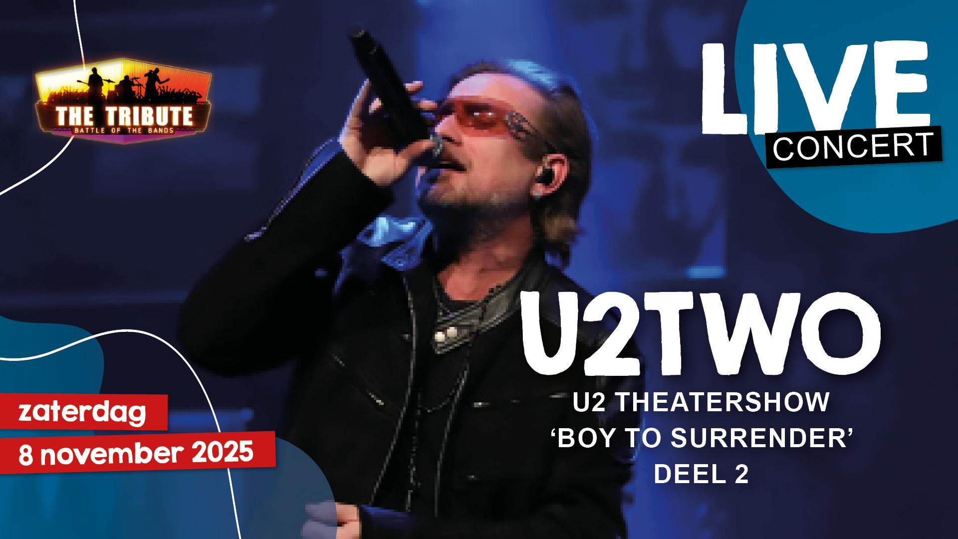 U2two – de U2 tribute band die speeltijd in Ziggo Dome Amsterdam veroverde in het populaire TV programma “The Tribute – Battle of the Bands”, brengt – tegen veler verwachting in - de wereldberoemde Ierse rockband naar het theater met een intieme, gevoelige en toch ook energieke combinatie van concert en voorstelling. Onder de verzamelnaam “Boy to Surrender” – vernoemd naar het eerst verschenen U2 album “Boy” en het laatst verschenen album “Songs of Surrender” (2023) – komt de band nu met deel 2 van de indrukwekkende U2 theatershow.